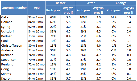 As you no doubt have heard, Russell M. Nelson passed away over the weekend, at the age of 101. A friend messaged me quickly to ask what this meant for probabilities of reaching the top spot for all the other Q15 members, so I thought I’d update the analysis I’ve done periodically.