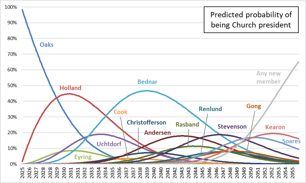 5. It’s interesting to see how much the graph has changed since this posting…Holland’s death made Uchtdorf’s curve surge upwards,while Elder Causse had a brief tenure as most likely in the early 2050s squelched by the addition of Elder Gilbert.