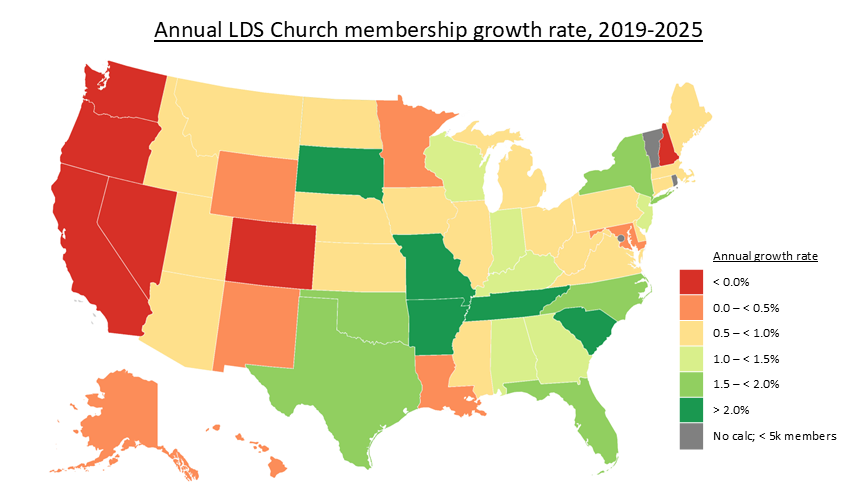 Compared to population size, a number of states are seeing decreasing LDS populations. Arizona (-0.2% annually), California (-0.7%), Colorado (-0.7%), Delaware (-0.1%), Idaho (-0.6%), Montana (-0.1%), Nevada (-1.0%), Oregon (-0.6%), Utah (-0.7%), Washington (-0.8%). With the exception of Delaware, these are all in the western US, and all places with higher LDS populations.