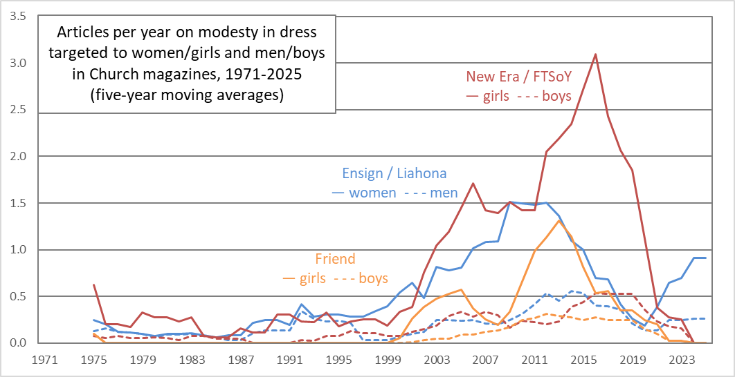 Over a decade ago (have I really been blogging that long?), I wrote a couple of posts (2011, 2014) where I counted up articles in Church magazines that talked about modesty in dress. Briefly, I found that modesty rhetoric had really ramped up since the turn of the millennium, and not surprisingly, was aimed more at women and girls than at men and boys.